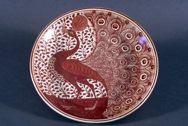 MediumHand-painted, glazed Staffordshire pottery with copper and silver luster decoration