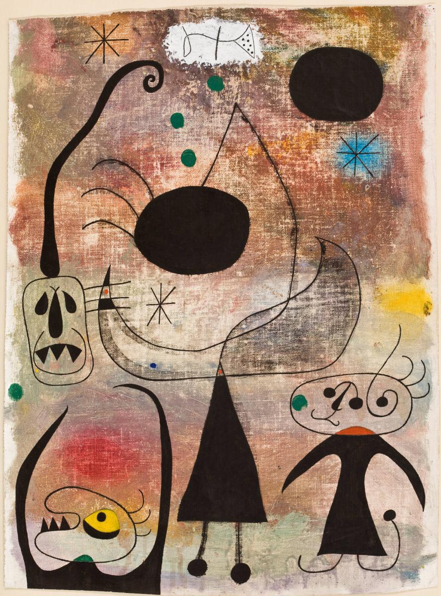 I produced a great deal at this time, working very quickly. And just as I worked very carefully [in the Constellations] which had immediately preceded these, "controlling" everything, now I worked with the least control possible-at any rate in the first phase, the drawing. Even here, however, only the broad outlines were unconsciously done. The rest was carefully calculated. The broad initial drawing, generally in grease crayon, served as a point of departure. . . . I drew carefully around the stains [in the canvas's ground] and made them the center of the composition. The slightest thing served me as a jumping off place in this period. .!.!. The first stage is free, unconscious; but after that the picture is controlled throughout, in keeping with that desire for discipline which I have felt from the beginning.The irregular shape of this work is original; the canvas was likely cut from a larger primed and stretched support, and small holes, filled and in-painted when they were noted in 1978, may indicate it was tacked to a support. It is one of forty the artist painted on unstretched canvases of irregular shapes. Another Miró in the AMAM collection-The Spokesmen of the Birds Plunges into the Night, made a decade later- is painted on cardboard and contains the biomorphic and animal shapes seen in the artist's earlier works, but in a composition which is more open.