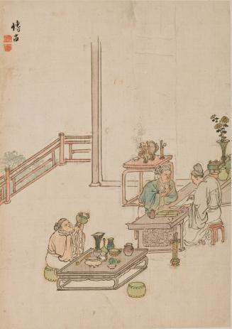 Three refined gentlemen sit at tables covered with bronze and ceramic antiquities. Smoke rises from a lion-shaped incense burner on a table in the background; chrysanthemums emerge from an ancient bronze goblet. One man drinks a small cup of wine while another examines a scroll. Another man holds a bronze vessel aloft to inspect the bottom.