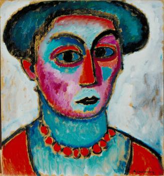 Not on viewOne of Jawlensky’s earliest mature works, this portrait of his assistant Hélène Nesnakomoff (whom he later married in 1921) marks the beginning of the artist’s lifelong experimentation with meditative variations on the theme of the human face or head. The glowing colors show the influence of the Fauves, while the heavy, dark outlines recall the work of Paul Gauguin. Jawlensky spent the summer of 1911 on the Baltic in Prerow (Pomerania). In 1937, he recalled this period, “This summer meant for me a great development in my art. There I painted… large figural works… in very strong, glowing colors and not at all naturalistic or objective. I used a great deal of red, blue, orange, cadmium yellow and chromium oxide green. My forms were very strongly colored in Prussian blue and came with tremendous power from an inner ecstasy.... It was a turning point in my art. It was in these years, up to 1914 just before the war, that I painted my most powerful works.”