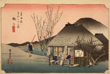 Not on viewMariko Station was famous for its grated yam soup, or tororojiru. At this teahouse, travelers can be seen enjoying the soup with gusto. Behind the teahouse, the blossoms of a white plum tree are just coming into full bloom. Hiroshige often places his images of plum blossoms on a pink background. In this composition, the pink and reddish colors give warmth to the scene and the blossoms stand out beautifully.