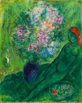 Not on viewIn this work the figure of a female nude—the artist’s companion Virginia Haggard McNeil—merges with the deep green hill on which she reclines, surrounded by fruit and flowers, symbols of fertility. Marc Chagall painted this scene in the wake of several traumas, including the death of his beloved wife Bella in 1944, and the horrors of World War II. A Russian Jew who had been working in Paris among notable artistic contemporaries such as Amedeo Modigliani and Fernand Léger, Chagall fled to the United States in 1941 to escape Nazi persecution.