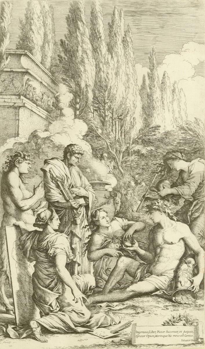 Not on viewOne of the most extravagant personalities of the Italian Baroque, Rosa viewed himself as an inspired genius. The inscription at the bottom of this print reveals Rosa’s view of his creative identity and capabilities: “Sincere, free, fiery painter, and equitable, / despiser of wealth and death. This is my genius.” The figures in the etching illustrate the inscription almost word for word, embodying various aspects of this highly complex ideological self-portrait. Rosa’s genius is represented by the reclining, handsome youth. Sincerity (Ingenuus) is the woman with a dove in her right hand and a heart in her left; Liberty (Liber) is the woman placing the cap on Rosa’s head; Painter (Pictor) is the kneeling woman at left holding a canvas; Equality (Aequus) is the standing man gesturing toward a book; and the female satyr behind Pictor is a representation of Rosa’s fiery, satirical genius (Succensor).