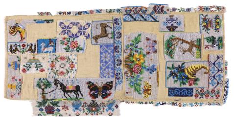 MediumBeadwork on linen depicting girls, rooster, lamb, horses, deer, butterfly; short pieces of bead work swen around border
