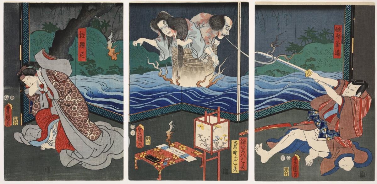 Not on viewThis three-panel print, or triptych, illustrates a tale of ghostly revenge by victims falsely accused. The samurai Mari no Kanemitsu (seen on the right) slept with the nun Kyodai (on the left), the widow of his brother, the local lord. Discovered by the lord’s loyal retainer, Matahachi, and the lord’s concubine, Kikuno, Kanemitsu instead accused them of an affair, and had the pair executed by tying them in a basket, which was plunged into a river. Their ghosts later appeared to haunt Kanemitsu and Kyodai, and are seen here rising in their basket from a painting of a river on a folding screen. Kyodai, wracked with guilt, later confessed, exonerating the ghostly duo.