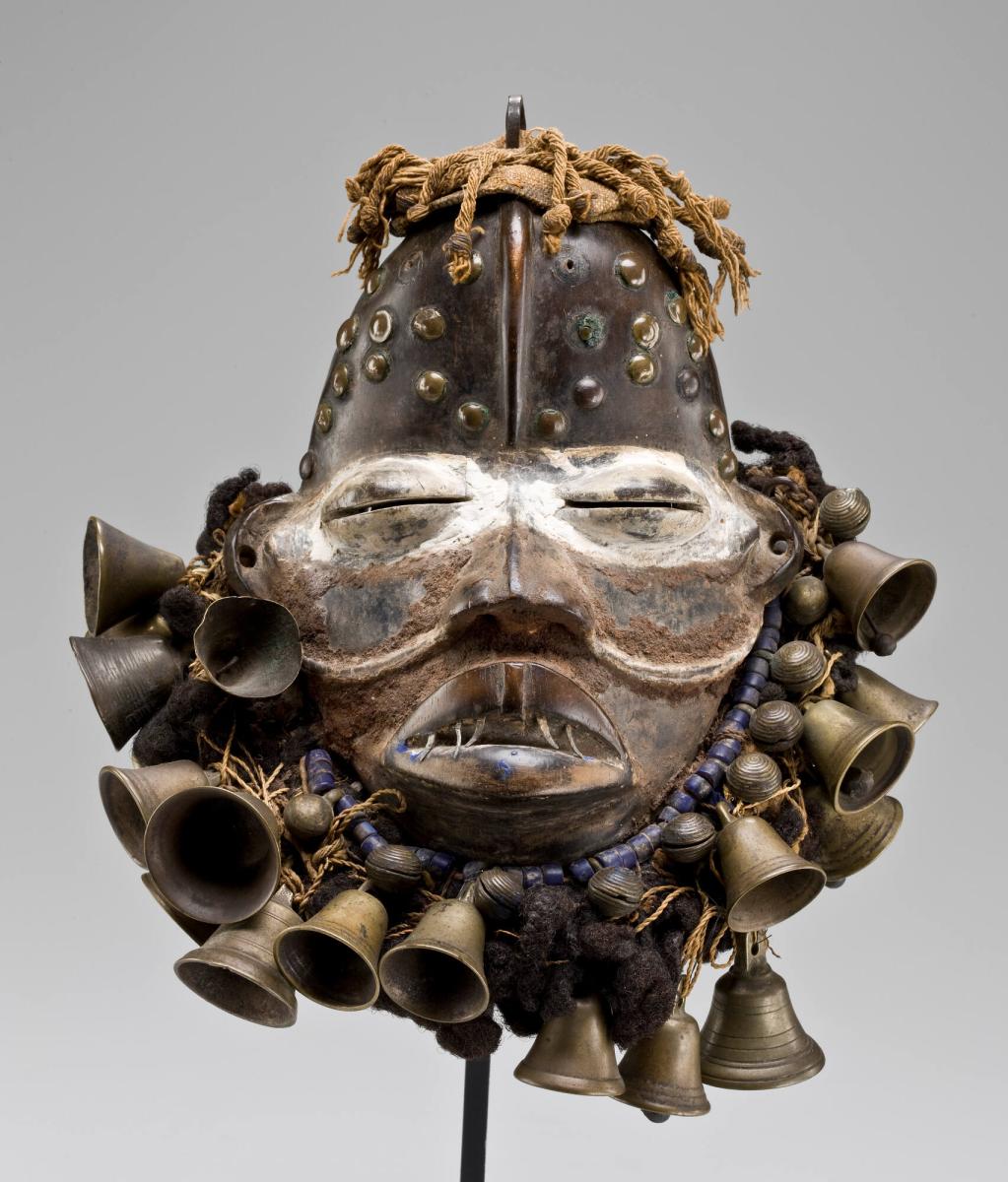 Forest spirits appear to humans in dreams and choose to be represented through male or female masks. Male masks-generally more aggressive in appearance, with geometric patterns, tusks, horns, and bullet cartridges-are considered more important than female masks. The beautiful and refined oval AMAM mask is serene in appearance, with its vertical scarification pattern, kaolin-covered eyes, and full mouth surrounded by braided human hair, bells, and striking blue glass beads. Many of these components incorporate empowering materials that invest the mask with supernatural force. The curved cheek mark, a characteristic that only appears on female masks, is clearly delineated here. A hook on the top of the mask and hooks along the lower edge were added in order to attach a conical cloth-covered headdress. A raffia skirt covering the dancer's upper leg would have completed the costume.