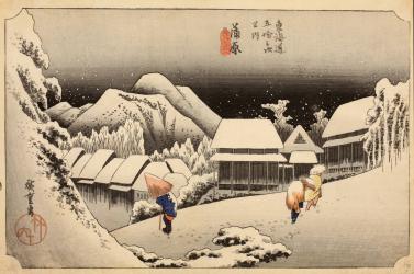 It is evening, and the snow is falling in large flakes: mountains, houses and trees are all being buried under a thick white blanket. On their way through the dark, two travelers and a local resident with bent back are trudging through the snow, depicted with Hiroshige's sensitive virtuosity. He often used Prussian blue in his work, which earned him the nickname "Blue Hiroshige." This picture shows a distinctive feature of his landscape: the extremely skillful manner of depicting snow, and the lyrical mood of the countryside.