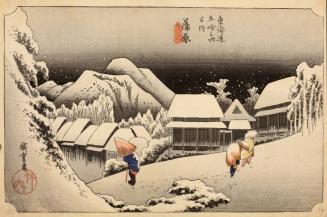 Not on viewFalling snow is a subject particularly suited to woodblock prints, but before Hiroshige this motif seldom appeared. Hiroshige's first picture with falling snow may have been this picture of three travelers in the village of Kambara.