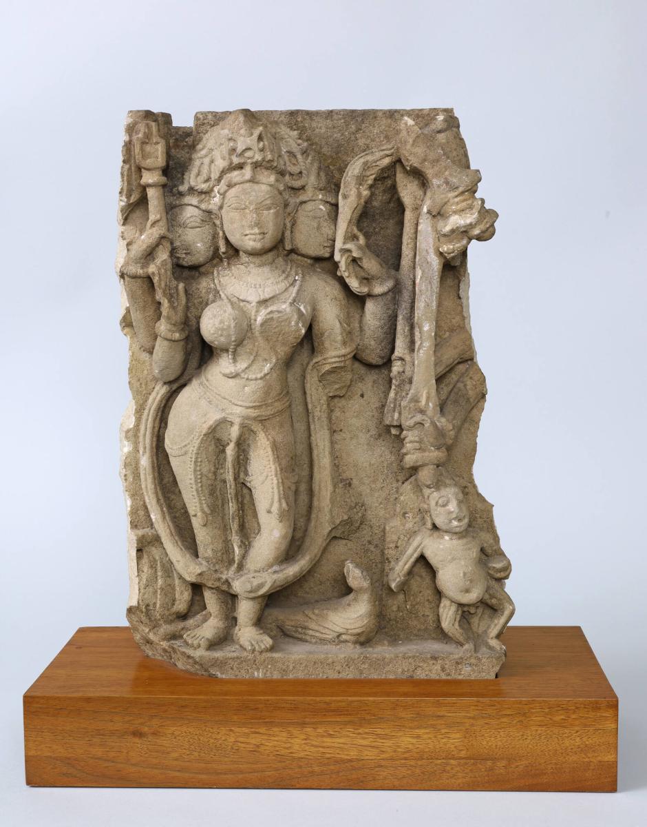 On viewBrahmi, or Brahmani, is a form of Devī (The Goddess) understood to be the shakti, or dynamic power, of Brahmā, the god of creation. Like Brahmā she has four faces (the one to the rear is not visible) symbolizing universal knowledge, and four arms that represent universal power. Her two forward arms once formed the symbolic gestures (mudrā) of fearlessness (right, palm forward fingers up) and generosity (left, palm forward, fingers down). Her upper arms hold attributes of Brahmā, the upper right a ladle (sruk) used in offerings and the upper left a brush of kusa grass, both of which refer to sacrifice. Below her is the vehicle of Brahmā and Brahmi, the haṃsa, often translated as swan or goose.
