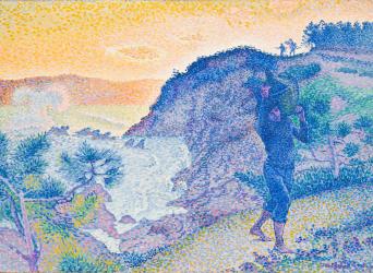 The Return of the Fisherman depicts a rocky inlet close by the village of Saint- Clair, where Cross made his home, near Saint-Tropez; here, the surf rolls in, bashing against the line of rocky outcroppings known as "Les Baleines" ("The Whales"), and sends up a plume of spray, as seen in the background at the far left of the canvas. A barefoot man, carrying a large jug on his shoulder, strides forward, and further along the winding path, two small figures make their way homeward. The clouds are backlit by the sun, which has fallen below the cliff, encircling it in a brilliant line of brightness. At the upper left, small blue strokes of paint begin to invade the canvas, heralding the coming dusk. Two drawings for the work are known, and Cross included a small color sketch of it in a letter he wrote to Signac in the fall of 1896.