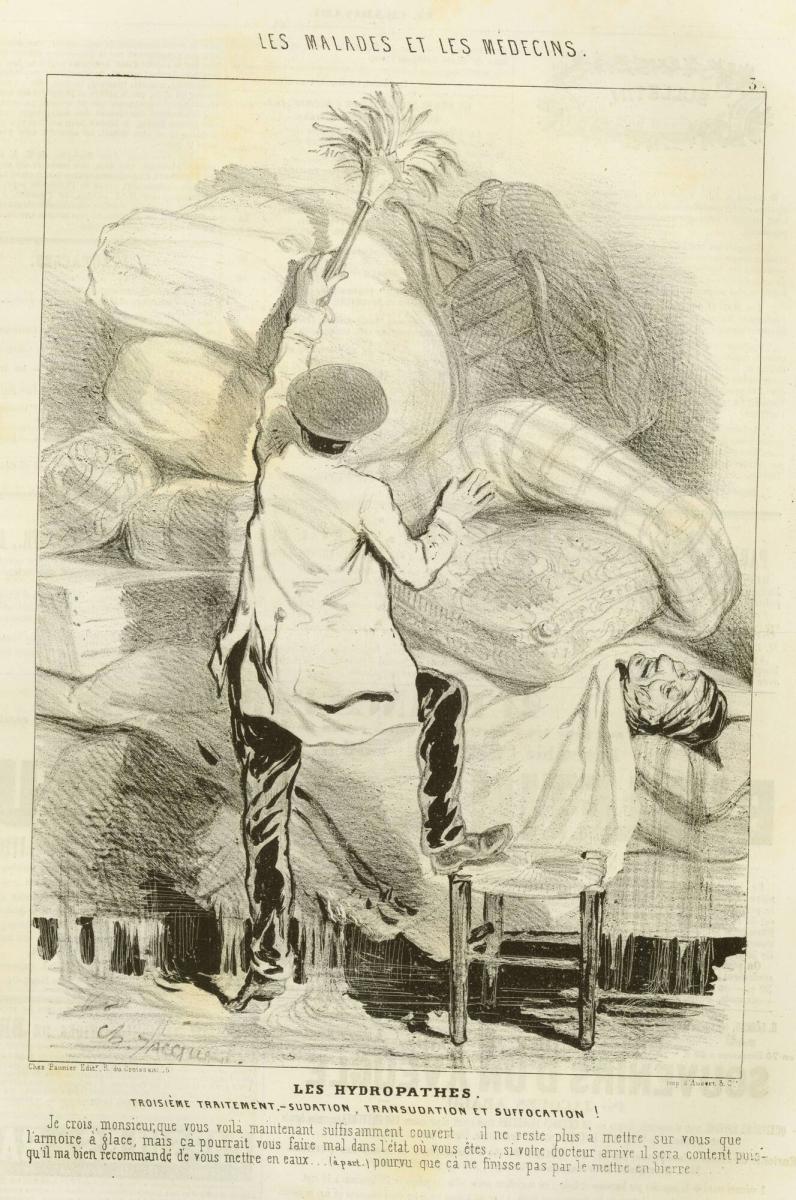 Not on viewCharles-Émile Jacque produced numerous satires of physicians and medical practices in his series Les Malades et les Médicins. This scene, which depicts a water treatment involving distinct stages of drinking followed by submersion and then sweating, shows a patient nearly suffocated while lying in bed under a towering pile of pillows. Meanwhile, a servant has arrived to dust.