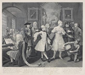Tom is seen here aping the fashionable aristocratic practice of the morning levee; holding informal meetings with visitors and tradesmen while the aristocrat—still dressed in his nightclothes—prepares for the day. Among the characters competing for his attention, and his purse, are a fencing master, dancing master, landscape architect, music master, huntsman, and jockey. All are offering their services to help Tom complete his fashionable lifestyle. Tom’s lack of judgement—especially when faced with people who want to exploit his wealth—and his pursuit of pleasure will be his downfall.