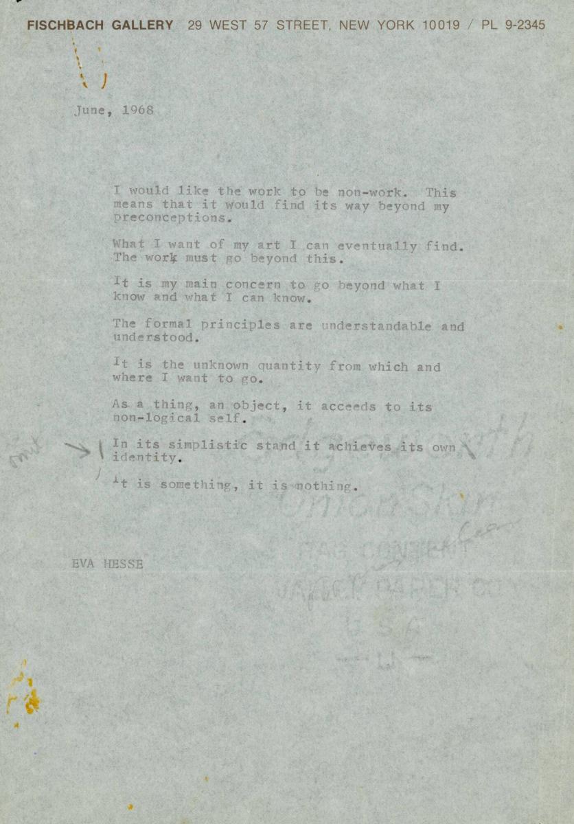 Artist statement for the exhibition "Eva Hesse: Chain Polymers" at the Fischbach Gallery, New York, NY, November 15-December 5, 1968