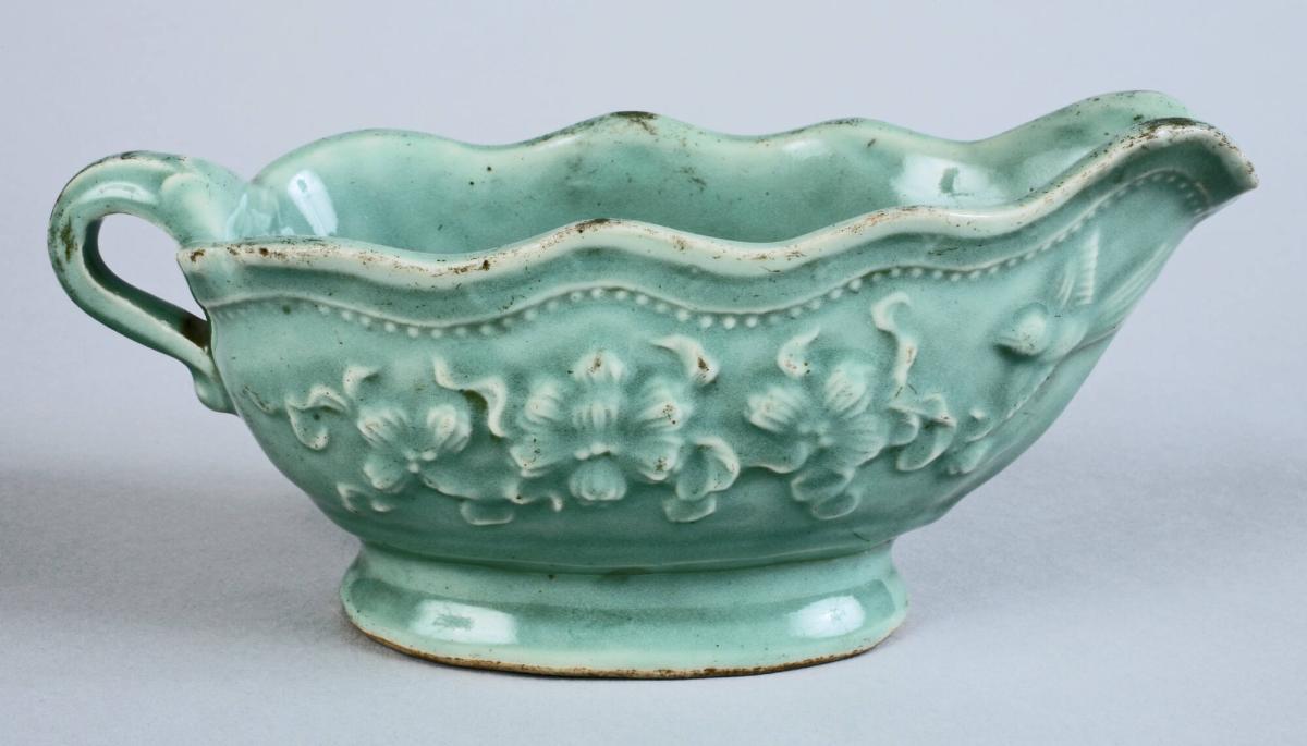 Celadon Sauce Dish (Katakuchi Shape) with Raised Floral Design