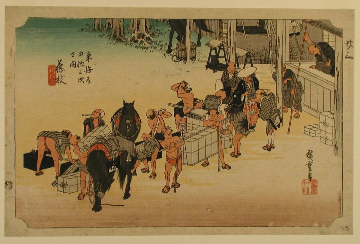 Changing Porters and Horses at Fujieda, no. 23 from the series Fifty-three Stations of the Tōkaidō