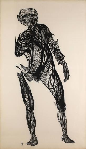 Baskin’s Hydrogen Man seems to have been mutated and twisted by radiation, his body distorted, given shape by repeated, interweaving, and overlapping lines. Baskin often used such lines to create a sense of form and shape in his figures, but here the lines suggest a view inside the body, an anatomical rendering of a nervous or circulatory system gone awry. The large size of the print makes it difficult to look away. The monumental, life-sized body stands fully upright in front of us, facing us, forcing us to confront a monster of our own making.