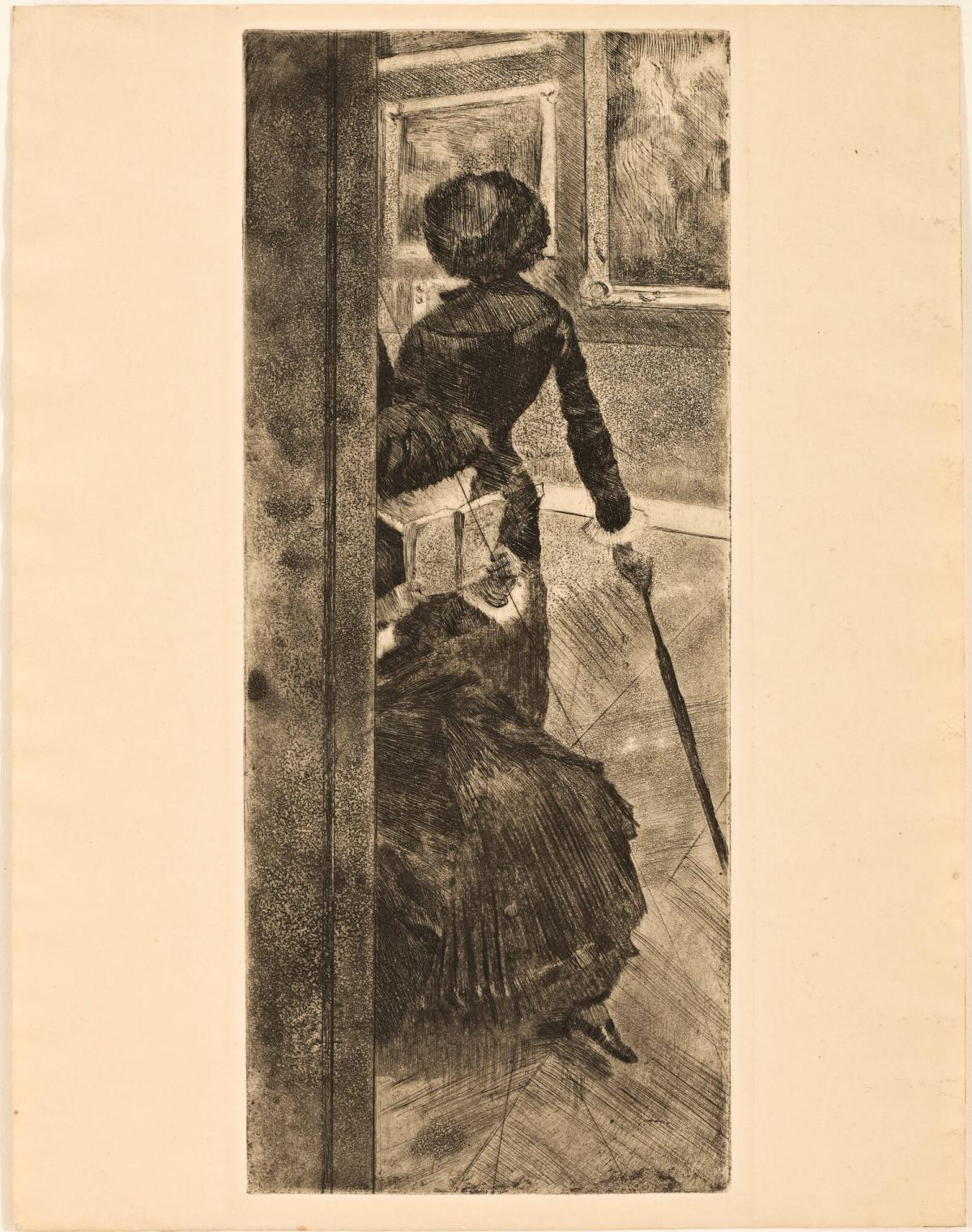 The absorption on his friend's face as she studies her book, and the narrow vertical format that abruptly cuts off the figures, are evocative of the experimental "snapshot" aesthetic of Degas's printmaking.