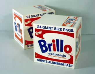Brillo Boxes originated as part of Warhol's first sculptural project, produced with the help of assistants at his "Factory," and exhibited in 1964 at the Stable Gallery in New York in the exhibition The Personality of the Artist. The exhibition included replicas of commonplace supermarket products, such as Del Monte peaches, Campbell's tomato juice, and Heinz ketchup, in addition to Brillo Boxes, the only nonfood item depicted in the show. Warhol's re-creation of the distinctive packaging, at significantly increased scale and in multiples, is part of his hallmark combination of popular culture with a mechanistic approach to making art. His use of repetitive commercial processes (such as the serially reproduced silkscreen), hard outlines, and flat areas of color evoke the mass-production of everyday items. Through his choice of subject matter and technique, and his work with a large group of assistants, he challenged the importance of the hand of the artist and the "uniqueness" of a work of art.