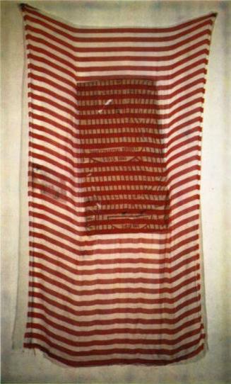 Not on viewThis diaphanous work comes from a series that Rauschenberg developed while travelling in Israel and India. Inspired by the unconventional ways craftspeople used paper and fabric, Rauschenberg began transferring texts and images, such as the lamb in this work, directly onto unstretched fabric using a solvent process. He added paper bags, cardboard, and other found elements. The vertical red stripes on the charcoal bag at the center of this composition contrast with the fabric’s horizontal red stripes. The play between vertical and horizontal, and between art and utilitarian objects, was central to Rauschenberg’s conception of painting as a representation of an object and the object itself.