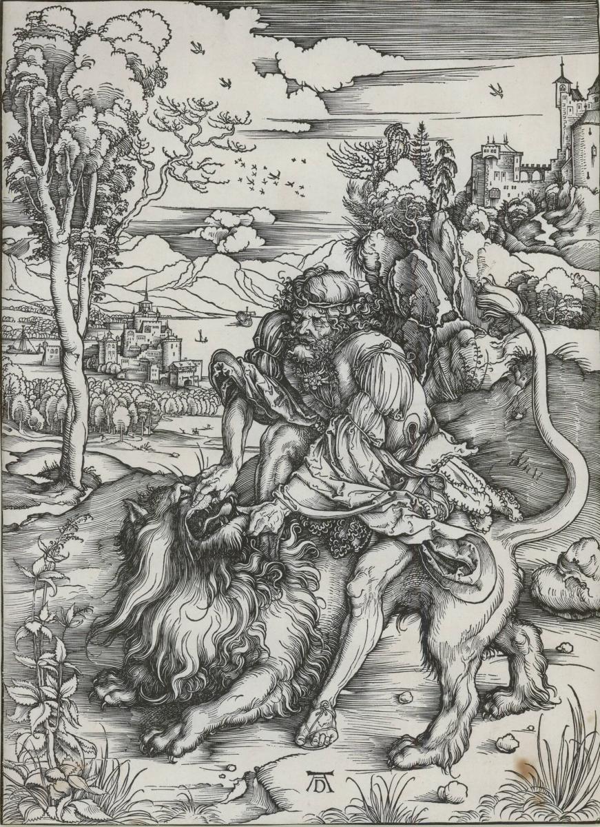 Not on viewDürer’s Samson Killing the Lion is among the earliest of the artist's works, completed when he was still in his twenties. Though it was made early in his career, this print highlights Dürer's adeptness at rendering textures, as evidenced by the delicate curls of the lion's mane. This print depicts the moment in Judges 14:5-6 when Samson, empowered by God, kills a lion with his bare hands. Since the Middle Ages, this story was regarded as a prefiguration of Christ's victory over Satan.
