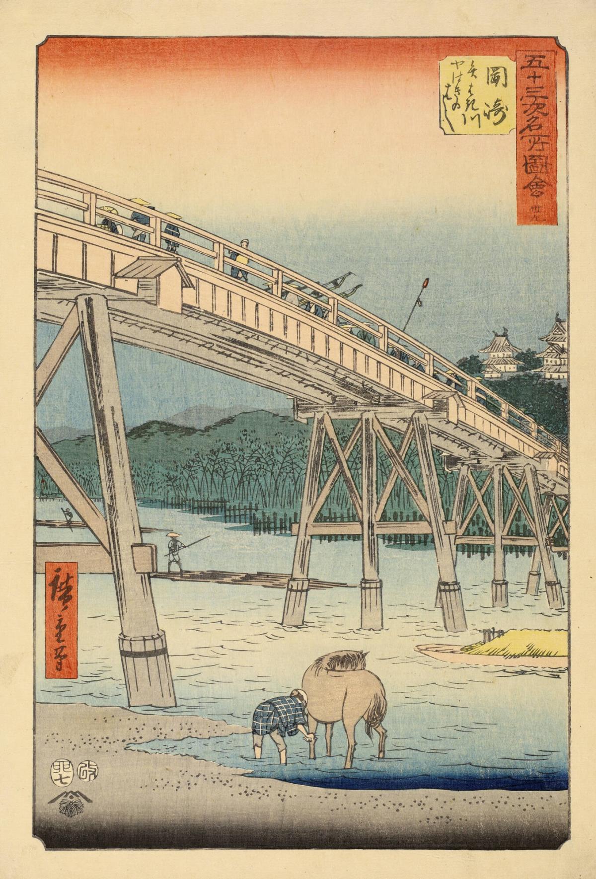 Yahagi Bridge on the Yahagi River at Okazaki, no. 39 from the series Pictures of Famous Places of the Fifty-three Stations, the Vertical Tōkaidō