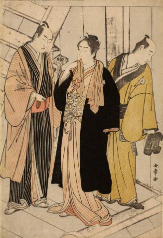 Not on viewIn 1780, Shunshō designed an illustrated book called Actors as Fuji in the Summer (Yakusha natsu no Fuji 役者夏の富士). Like Mt. Fuji in the summer with no snow, these were images of kabuki actors backstage with no makeup. Although still idealized representations, the sense that one could glimpse the private lives of popular actors proved irresistible to theater fans. This innovative subject was a great success, and Shunshō went on to produce full color prints of the same theme, like this one.