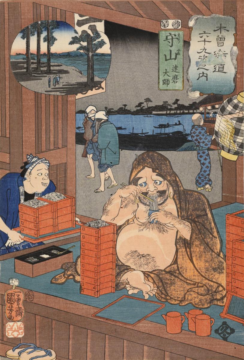 Moriyama: The Zen Patriarch Bodhiharma Eating Noodles at a Restaurant, no. 68 from the series The Sixty-nine Stations of the Kisokaidō