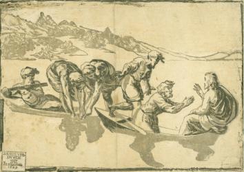 This print by Ugo da Carpi depicts the miraculous draught of fishes, as told in Luke 5. Although they had not caught any fish the night before, at Jesus' request his disciples placed their nets back into the water. To their surprise, the nets soon started to overflow with fish. In the aftermath of this miraculous occurrence, Peter bows down to Jesus, who sits at the far right.