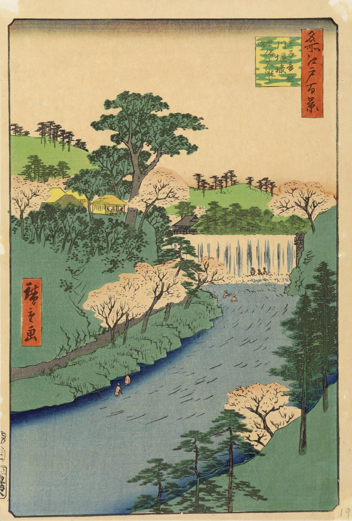 The Dam on the Otonashi River at Ōji, Popularly Known as "The Great Waterfall" (Ōji Otonashigawa entai, sezoku Ōtaki to tonau), from the series One Hundred Famous Views of Edo (Meisho Edo hyakkei)