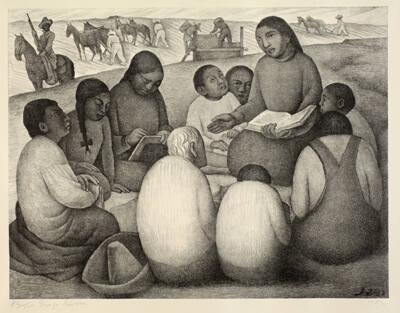 Not on viewEducation was a central part of Diego Rivera's perspective on how to empower and unify the lower classes, a perspective shared by the revolutionary governments in the 1920s and 1930s. It is not surprising, then, that Rivera would turn to this theme frequently in his murals. The image here derives from a 1924 fresco at the Ministry of Public Education in Mexico City. It shows Rivera's preference for scenes of the post-revolutionary reconstruction of Mexican life, as opposed to muralists like Orozco who often portrayed the violence, disillusionment, and suffering of the war years. Although not their primary medium, lithographs nevertheless proved a useful supplementary source of income for muralists and a means of disseminating their images to a wider audience.