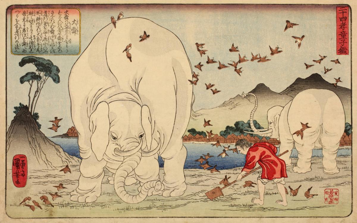 Elephants and Birds Helping Da Shun (Tai Shun) Cultivate Land in the Li Mountains Whence He was Driven by His Family's Cruelty, from the series A Mirror for Children of the Twenty-four Paragons of Filial Piety