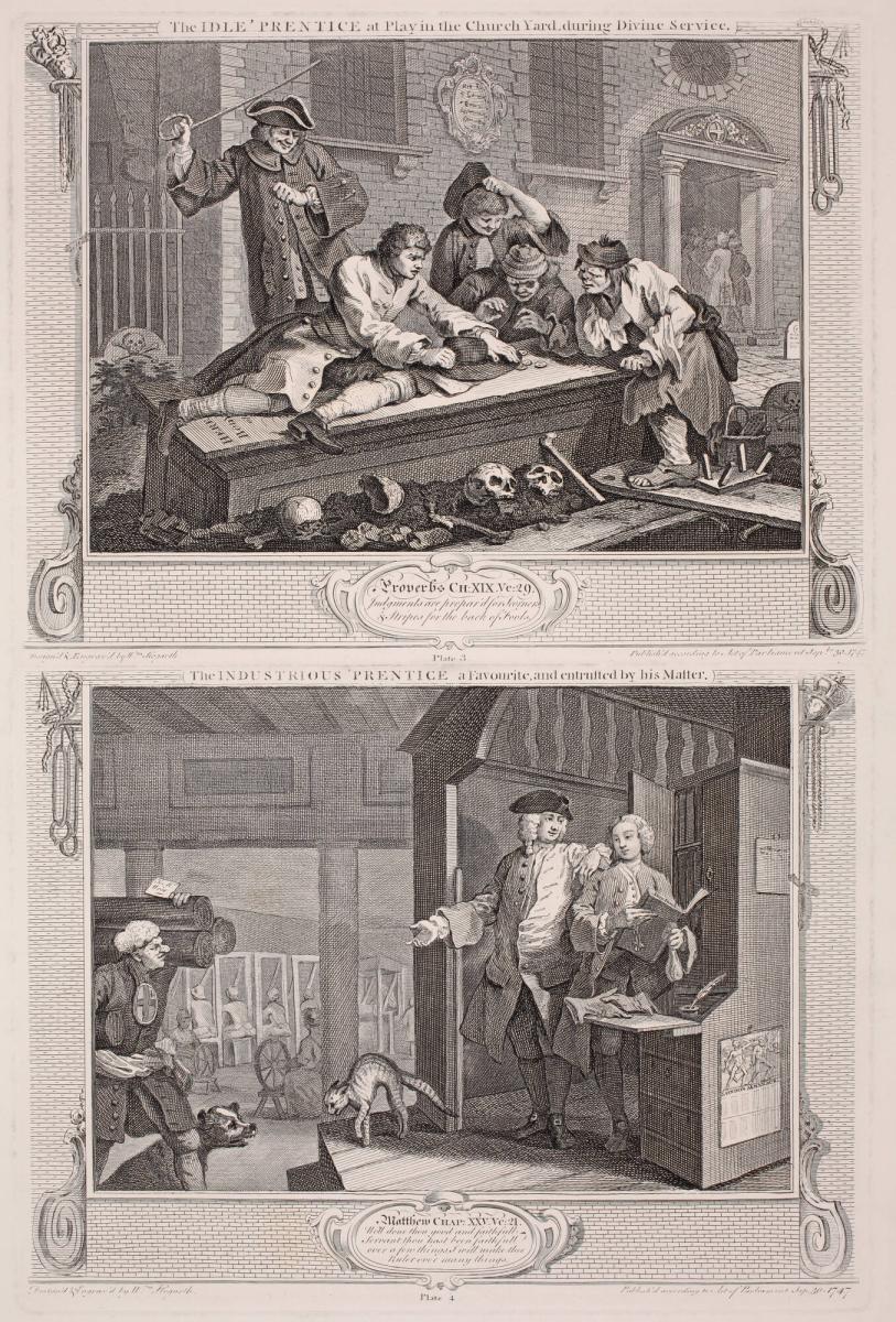 The Idle `Prentice at Play in the Church Yard during Divine Service, plate 3 from the series Industry and Ildleness; The Industrious `Prentice A Favorite and Entrusted by his Master, plate 4 from the series Industry and Ildleness