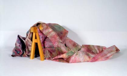 Gilliam gave the AMAM this major work three years after he was invited to Oberlin in March 1970 as an artist-in-residence. Softly Still is one of his classic "Draped" paintings. These radically innovative works liberated the canvas from the realm of easel painting, fashioning them into free-form installations. Gilliam soaked a canvas in brilliant pinks, greens, reds, and yellow-orange, and, draping the whole over a wooden sawhorse, created a piece that resonates with poetic harmony. Each time the work is placed on view, it takes on a slightly different form and appearance. The five yards of canvas that Gilliam used to create Softly Still are bulky and difficult to manipulate. Ironically, when the work is installed, it creates a monumental sculpture with a great sense of weightlessness. The sawhorse itself references the mass- produced tool used by carpenters, but Gilliam made this one himself.