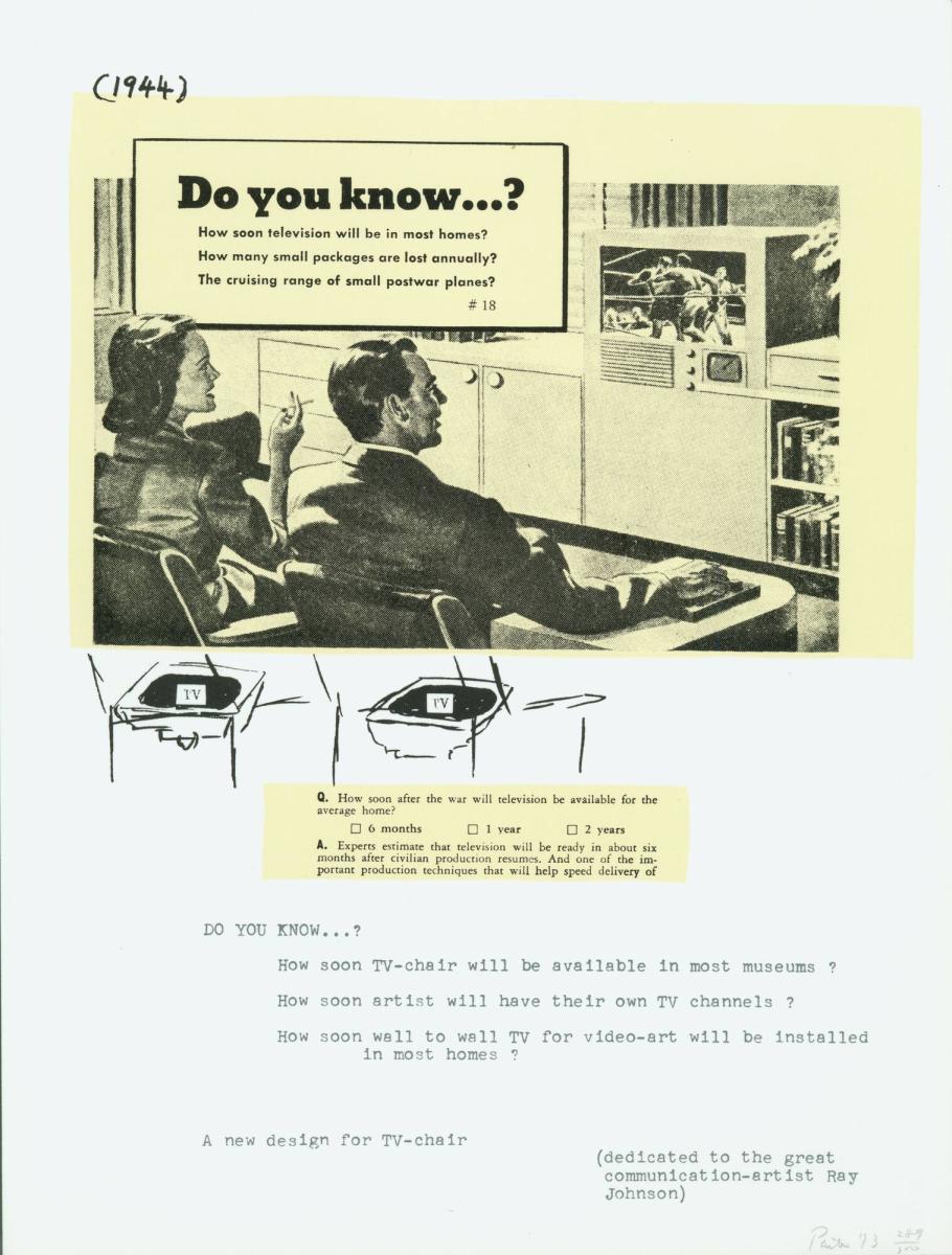 In this print, Paik repurposed an advertisement from a 1944 popular science magazine to offer a “new design for [a] TV-Chair.” The print references one of his earlier works, TV Chair (1968), in which he placed a television monitor in the seat of the chair and a camera above it. Here, Paik added rough sketches of “TV chairs” under the figures in the advertisement, as well as a series of typewritten questions playfully predicting the ubiquity of video art. In the bottom-right corner of the print, Paik dedicated the print to Ray Johnson, who shared a similar interest in questioning artistic modes of display, distribution, and access. Like Johnson’s mail art, Paik’s print references and repurposes images found in the American cultural lexicon.