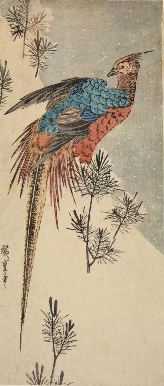 Copper Pheasant Among Pine Shoots on a Hillside in Snow