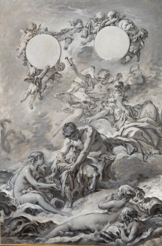 On viewThis painting, done entirely in grisaille (shades of gray, black, and white), depicts the sea-nymph Thetis presenting her son Achilles to the muscular centaur Chiron, who tutored the young hero. Hovering behind are Athena, goddess of wisdom, and Fame, who holds trumpets and wreaths; above, a chorus of putti with copiously dimpled flesh drape garlands around empty medallions. The work is an allegory of the education of Louis XV: in 1717, at the age of seven, he was taken from his governess, the Duchesse de Ventadour, and given to the care of a governor, the Duc de Villeroy, and male tutors.