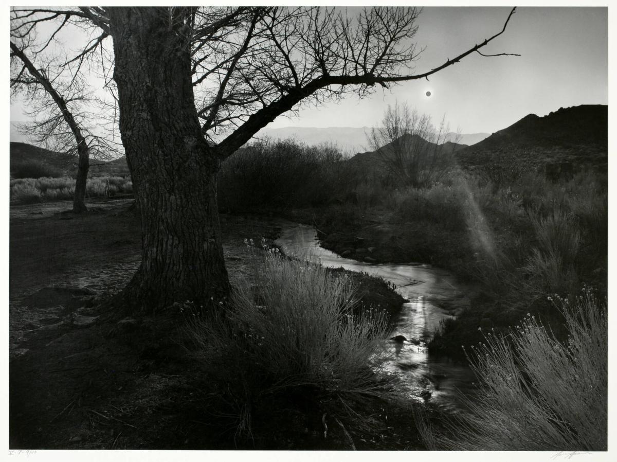 Not on viewA black sun floats over the landscape of the American West, at once casting light and a sense of foreboding over the landscape. When Adams took this photo in 1939, Tungsten Hills was still home to a major mining operation. Rather than aim his camera at the burgeoning industry nearby, Adams characteristically captures the land’s natural features with dramatic tonal contrast. This image participates in the rhetoric of manifest destiny, and a tradition of depicting U.S. landscapes—particularly in the West—as uninhabited and ripe for development and exploration.