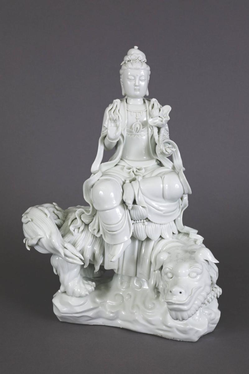 The medium is Blanc de Chine (Chinese White) or Dehua Ware, named for the county in China’s Fujian province that produced works of pure white porcelain, most famously used for religious icons such as this one.