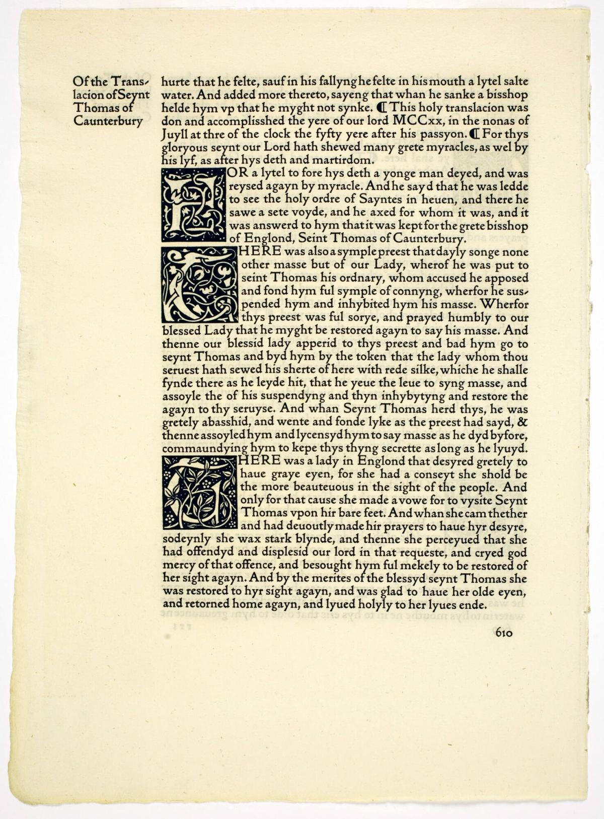 Not on viewPoet, painter, textile and book designer, architectural preservationist, pioneering Socialist, and founder of the British Arts and Crafts movement, William Morris demonstrated astonishing intellectual and creative prowess. Revolting against mechanization, he advocated a return to traditional, hand-made techniques and a respect for the artist-craftsman. His Kelmscott Press, founded in 1891, revolutionized printed books by using handmade materials and processes, and creating harmonious relationships between text, ornament, and image. Morris's 1892 edition of The Golden Legend - a thirteenth-century chronicle of the lives of the saints - was the Press's seventh book. The translation is that of William Caxton, the first English printer; an avid collector, Morris owned a copy of Wynken de Worde's 1512 version of Caxton's Golden Legend.