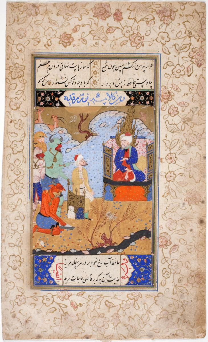 This entire manuscript page, or folio, is a pastiche of an unrelated 16th century painting and texts assembled together in the 20th century. While the the painting is very good, particularly the figures, the gazelles and tree at the top were probably overpainted, over gold that was also added later. Golden sky is not typical in Persian painting of the period, but the gold and the colors and style are characteristic of Central Asian painitngs in a Persianate style, probably from the Uzbek kingdom of Bukhara. The text on the verso relates to King Sulayman, and may have been selected as a verso to add to the painting, which probably represents King Sulayman, often shown enthroned with a flaming halo and shown with jinn and demons. The text of the recto, at the top and bottom of the painting, is completely unrelated: poems by the Persian poet Hafez (1325-1390).