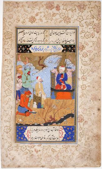 Not on viewThe illustration at the center of the folio depicts King Sulayman (Solomon). The story of King Sulayman is a parable retold and depicted many times in Islamic literature and art. Before the king are his vizier, Asef, and a group of jinns and demons, with whom King Sulayman had the power to speak. The attention to detail, the figures’ gesticulations that are indicative of ongoing conversation, the rejection of modeling and perspectival space, and the use of opaque, bright colors are all typical of Islamic miniature painting. The dark stream at the bottom was painted with silver, which has oxidized.The mushroomy rocky forms and the curly clouds in the background, however, as well as the use of washes for their depiction, reflect inspiration from Chinese painting.