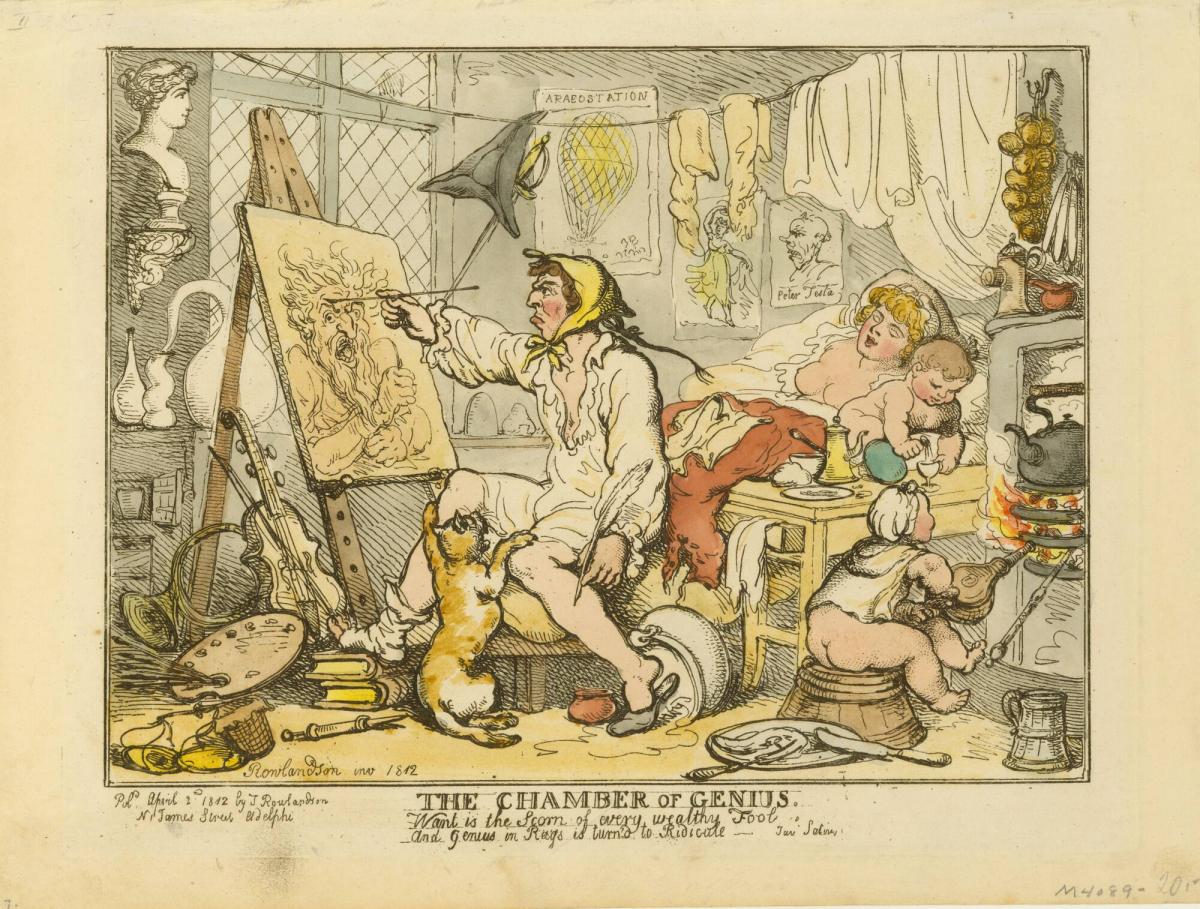 Thomas Rowlandson’s print plays on the Romantic notion of an artistic genius who disregards all mundane concerns unrelated to his art. The poem beneath the etching’s title is a quotation from the ancient Roman poet Juvenal: “Want is the Scorn of every wealthy Fool / And Genius in Rags is turn’d to Ridicule.”