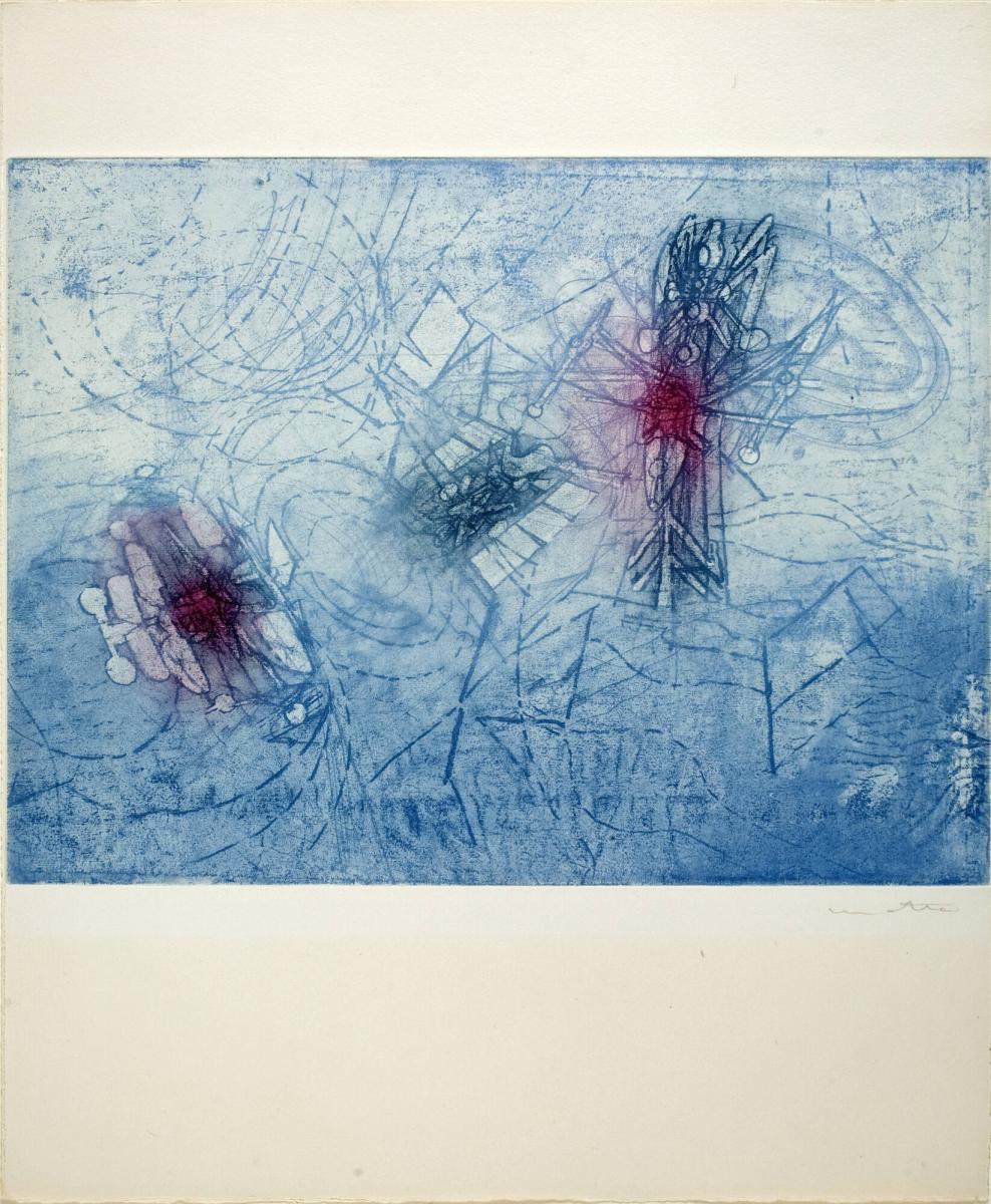 Matta began to devote himself to print media during the late 1950s, mastering a number of complex color printmaking techniques. This work derives from the 1962 series Come detta dentro vo significado, whose title is taken from a line in canto XXIV of Dante’s Purgatory which roughly translates to “I am one who, when Love inspires him, takes note, and then, writes it in the way he dictates within.” This print recalls Matta’s painted “inscapes,” which seek to represent the interior space of the mind and juxtapose recognizable geometric shapes with more organic elements.