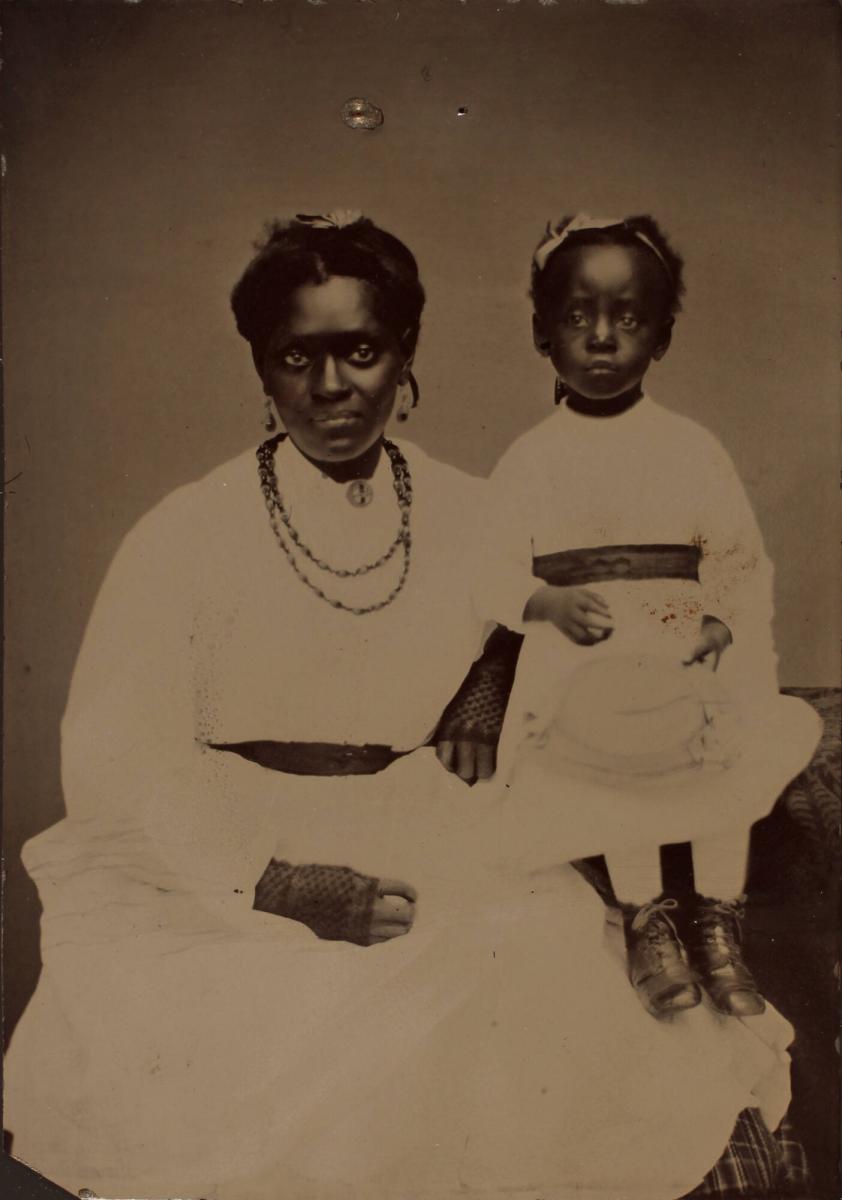 Not on viewTintypes were an affordable way for middle and lower classes to have their portraits made. Due to their small size, they were easily mailed and mounted in albums. Tintypes remained in use until approximately 1880, when the gelatin-silver process became the dominant medium. This example is notable because of the sitters’ confident presentation of themselves as middle-class, a more sympathetic presentation than most contemporary depictions of African Americans. The identity of the sitters and the recipient of the photograph remain unknown.