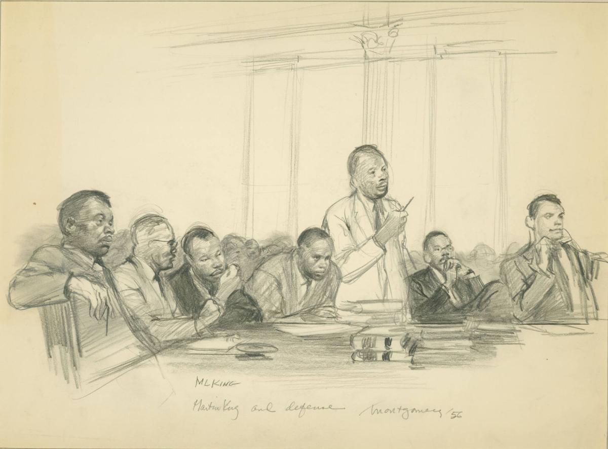 Trial of M. L. King, from a series of drawings documenting the 1956 Montgomery Bus Boycott, Montgomery, AL