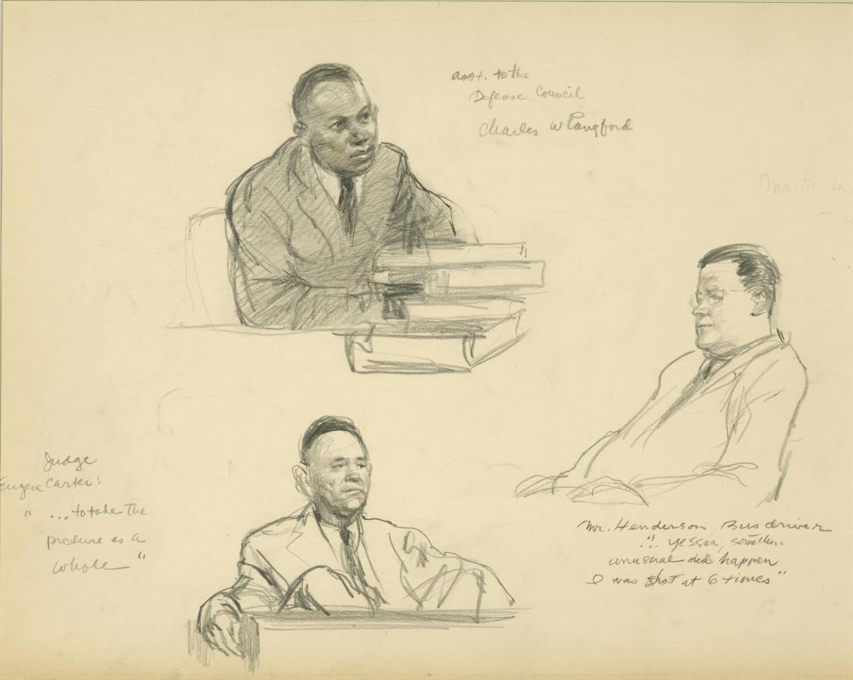 Trial of Martin Luther King - "Yessir, somethin' unusual did happen...I was shot at six times.", from a series of drawings documenting the 1956 Montgomery Bus Boycott, Montgomery, AL