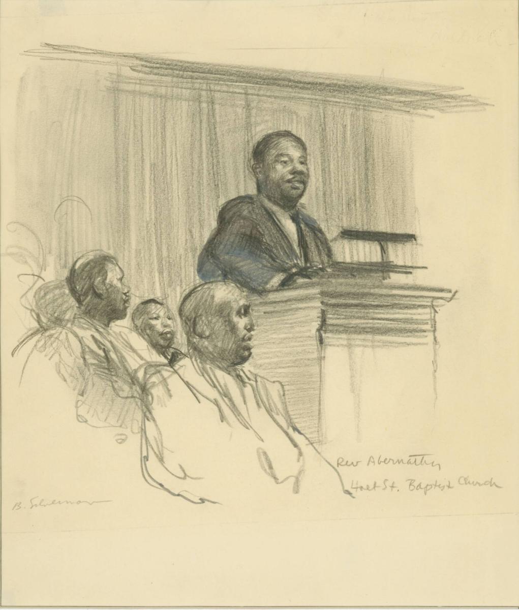 Rev. Abernathy, from a series of drawings documenting the 1956 Montgomery Bus Boycott, Montgomery, AL