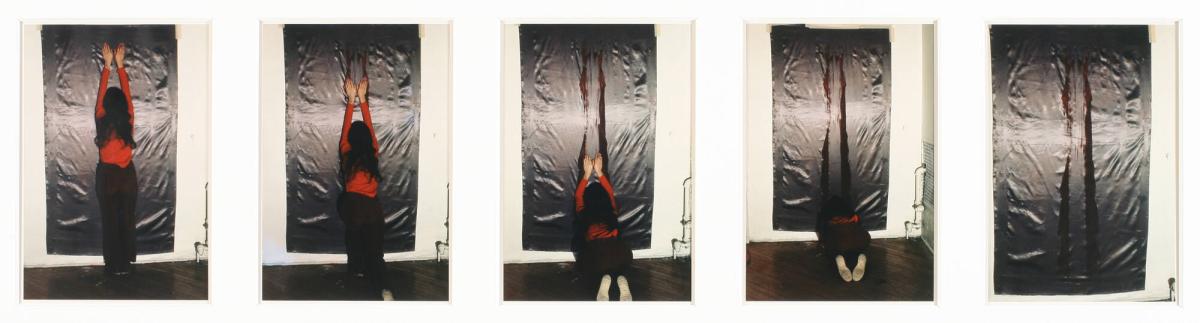 Not on viewCuban-born artist Ana Mendieta utilized her body as a catalyst for ephemeral actions, subsequently preserved only through documents and photographs. She often staged her performances out in nature, uniting her body with the landscape. In Body Tracks, blood-red smears of paint trace the strokes left by Mendieta’s arms, recorded in five stages. This simple, momentary act and its reference to bodily fluids evoke a religious ritual.