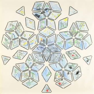Not on viewIn this work, Matta expands his interest in form and spatial relationships with a composition based on a geodesic dome structure. When cut out and assembled (as per instructions illustrated on a poster for an exhibition by American sculptor and architect Bernard Kirschenbaum at the Park Place Gallery in New York in 1967), Matta’s dome evokes both macrocosmic and microcosmic universes. The few extant proofs of this rare, unpublished print were made at the Atelier Georges Visat in Paris in 1968, a time when Matta and many of his fellow artists were occupied with the political upheaval surrounding the student movement.