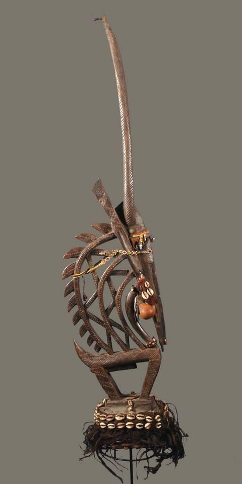 These headdresses always appear in pairs, one male and one female, on performers who are completely camouflaged in a costume of fiber dyed black.
